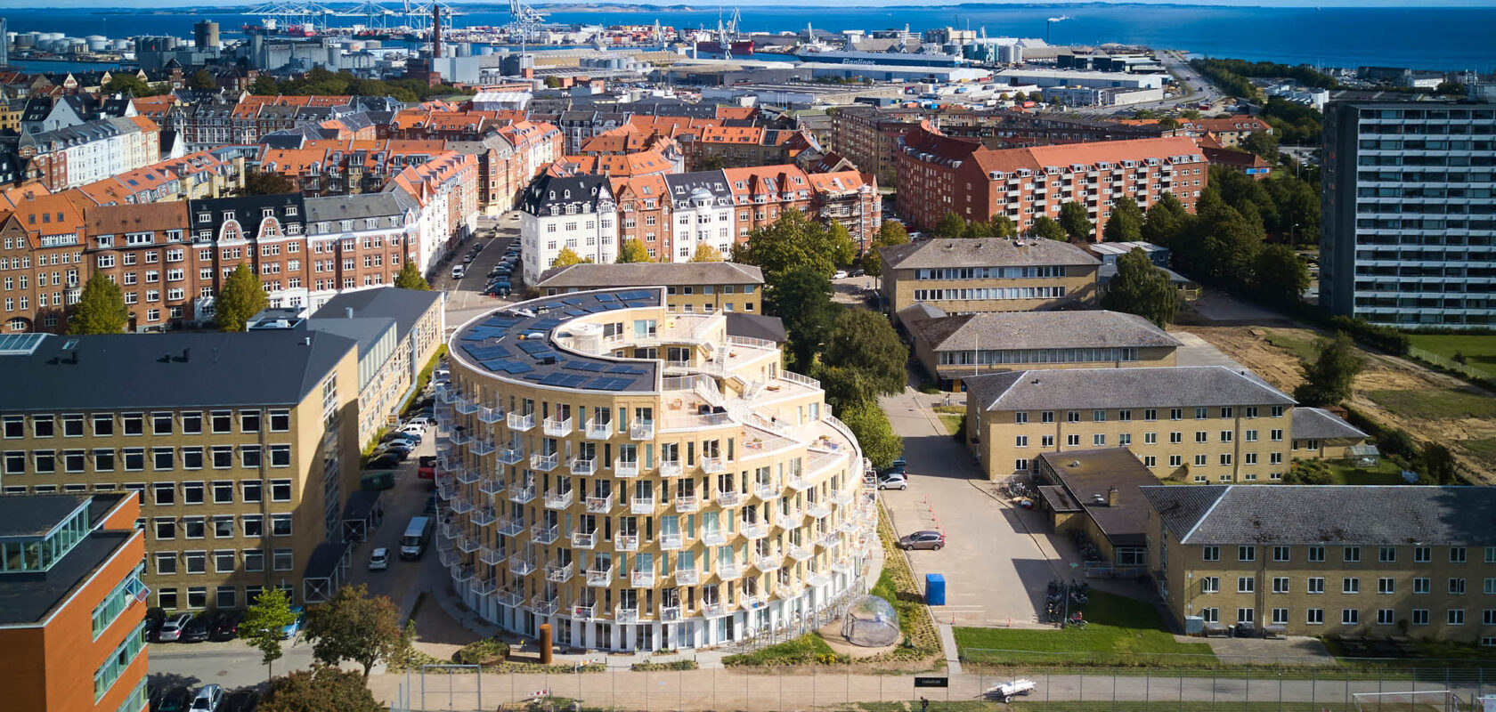 Det cirkelrunde byggeri “Den Runde Karré” består af 100 studie-og ungdomsboliger og varierer i højden fra 3 etager mod syd til 7 etager mod nord på Frederiksbjerg i Aarhus. Lejlighederne har altaner med front udad og ind i byggeriet, mens den runde form mod syd trappes ned og ender tagterrasserne til fælles ophold.